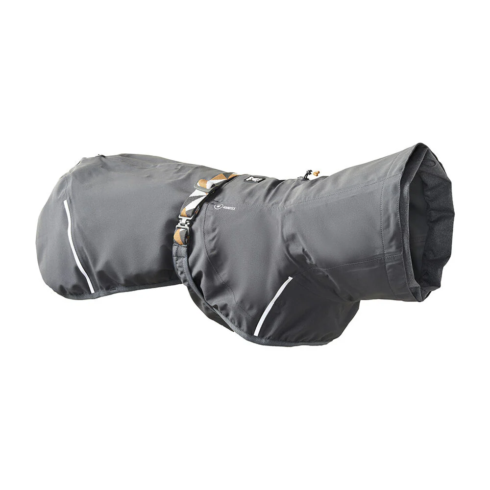 Tässä ohuessa koiran sadetakissa ei ole kankaista vuoria vaan sileä vedenpitävä laminointi. Sateen läpäisevyyttä on mietitty viimeiseen asti kaikissa yksityiskohdissa. Valjasaukon voi sulkea neppareilla, jolloin vesi ei valu koiran selkään. Vedenpitävän sadekauluksen saa kiristettyä korvien taakse, jolloin vesi ei valu koiran niskaan. Lisäksi takin kaikki saumat on teipattu vedenpitäviksi.